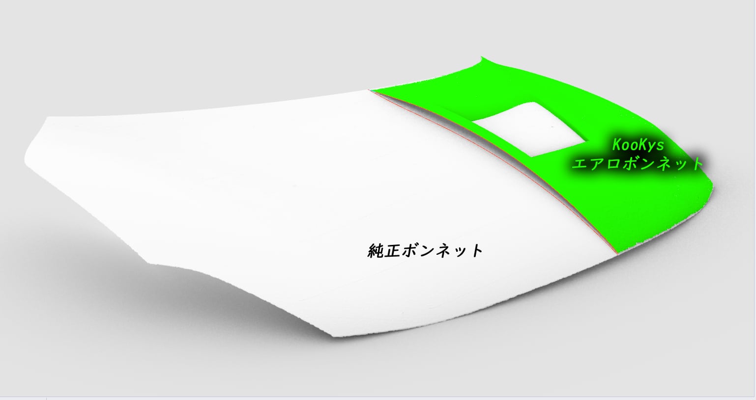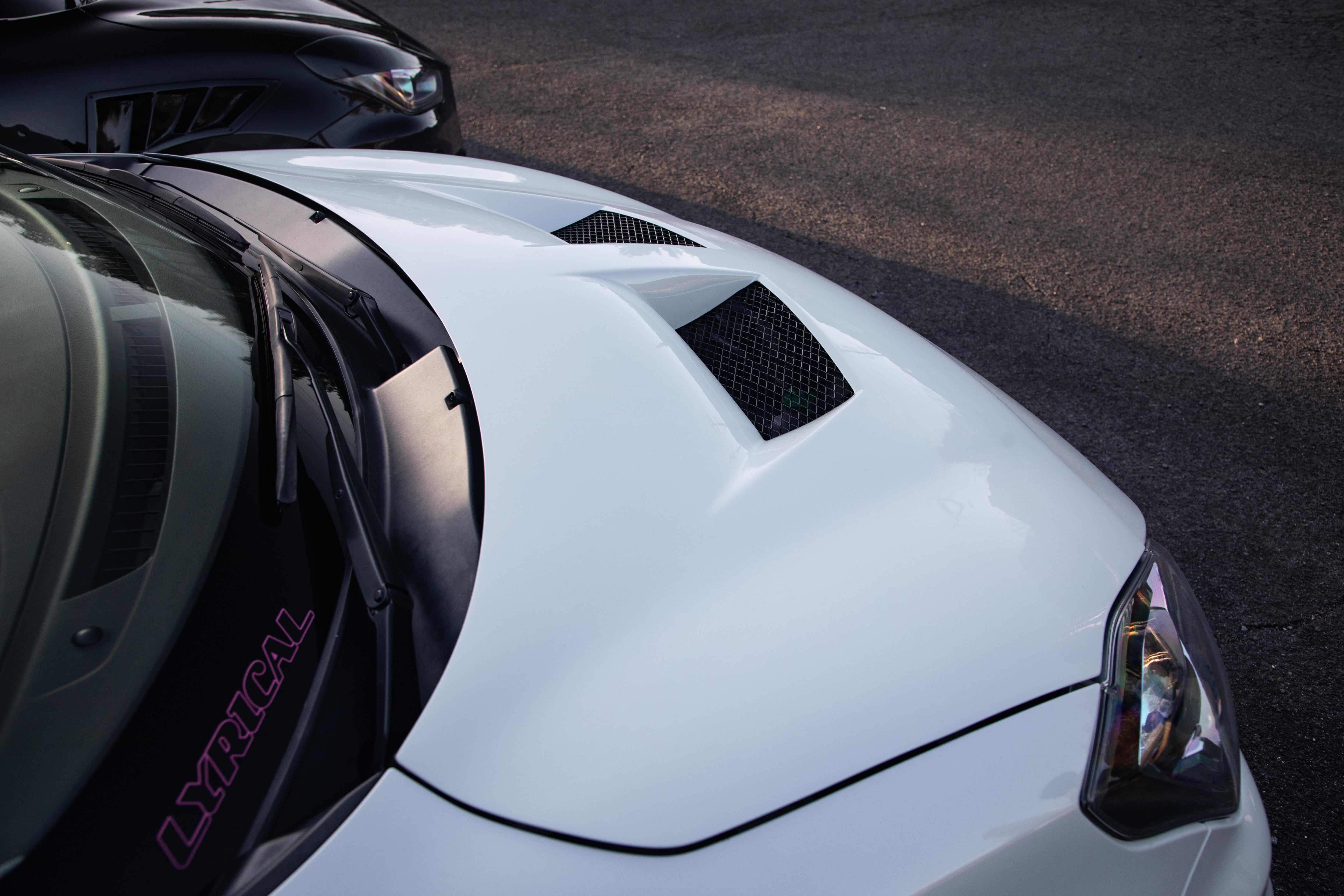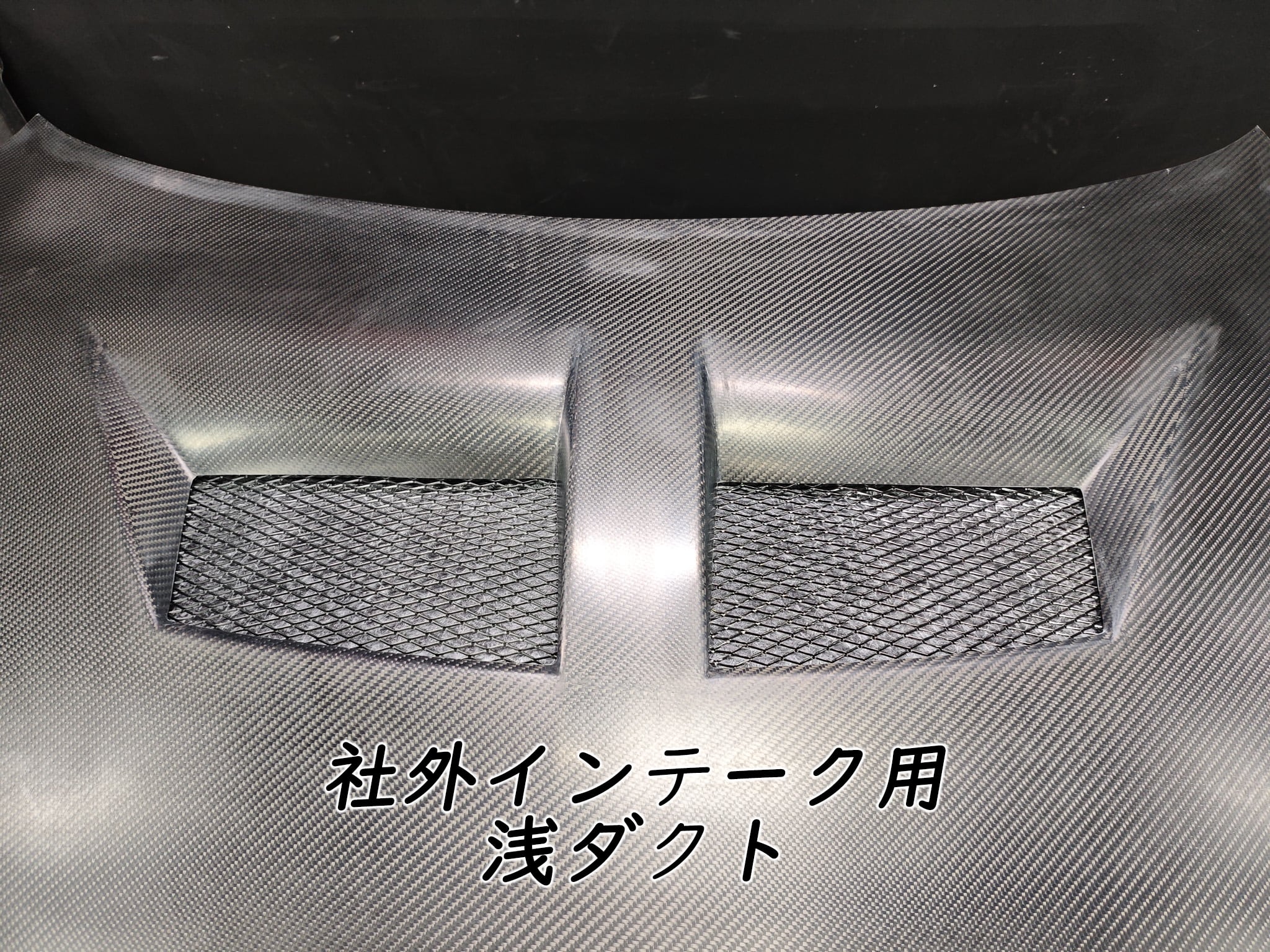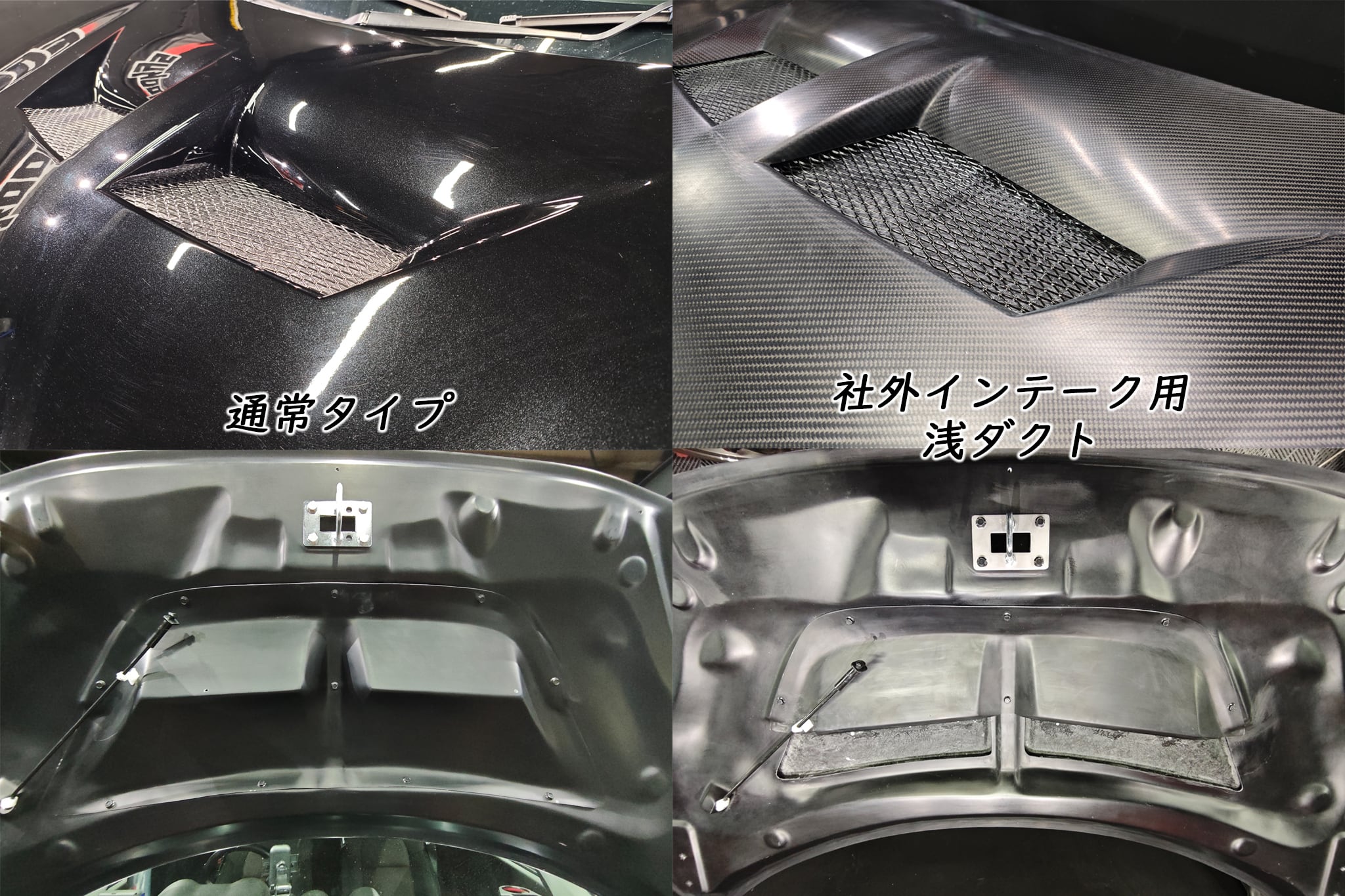 こちらのボンネットは社外インテークがついていると取り付けられませんが、社外インテーク用にダクトの穴を浅くしたタイプもあります。(比較写真参照)